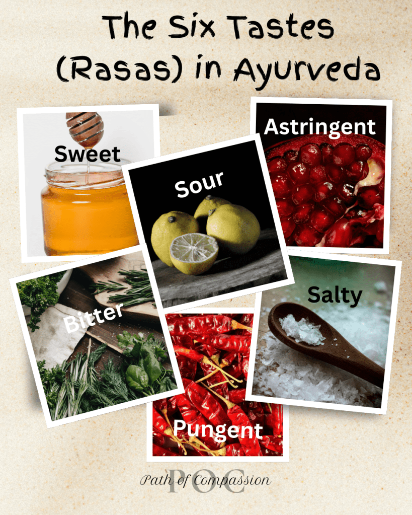 The six tastes (rasas) are fundamental for creating nutritious meals that balance the doshas. Including all six tastes reduces cravings, ensures complete satiety, optimal digestion, physical, mental, & spiritual nourishment.